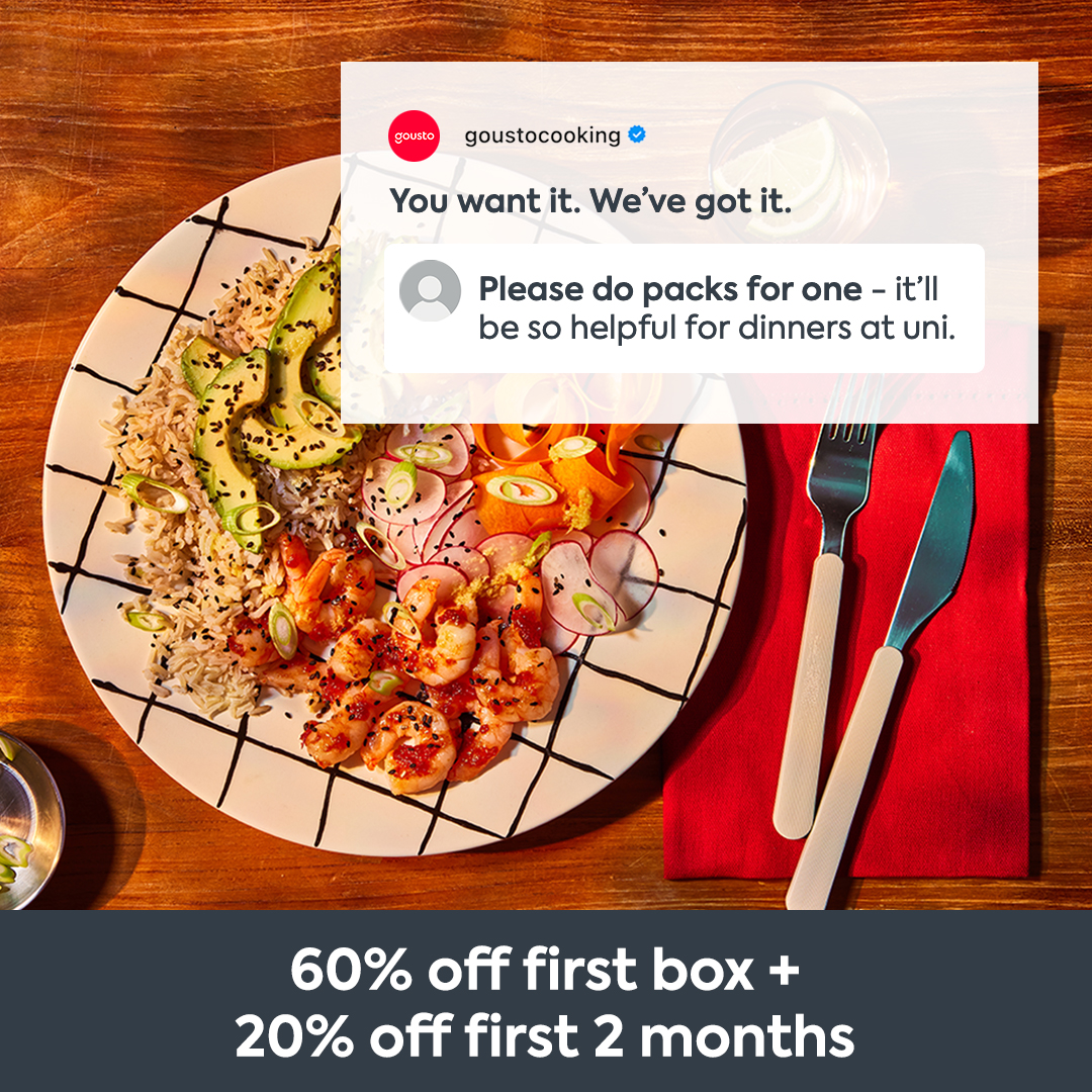 Open our menu today and get 60% off your first Gousto box and 20% off all boxes for 2 months.